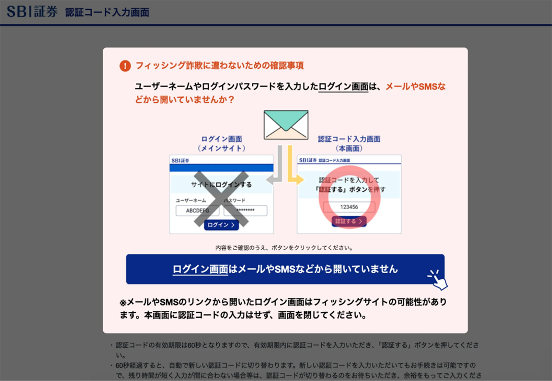表示されたフィッシング詐欺に遭わないための確認事項を確認のうえ、認証コードを入力してください。