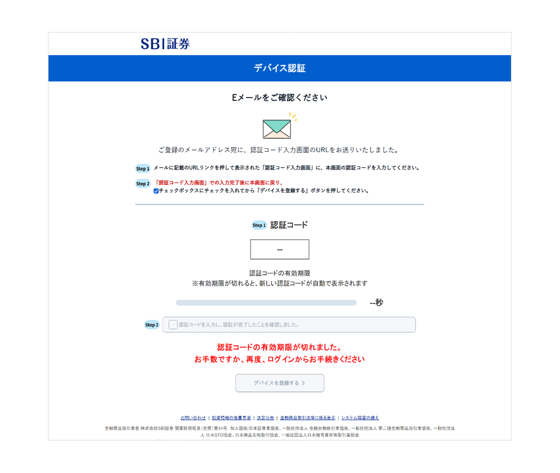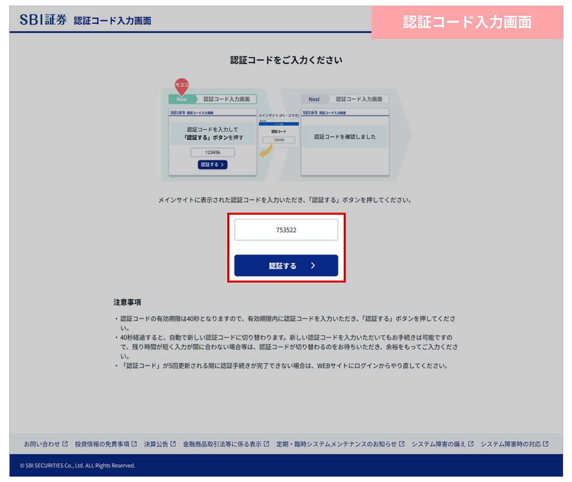 「認証コード」が5回更新される間に認証手続きが完了できない場合は、WEBサイトにログインからやり直してください。